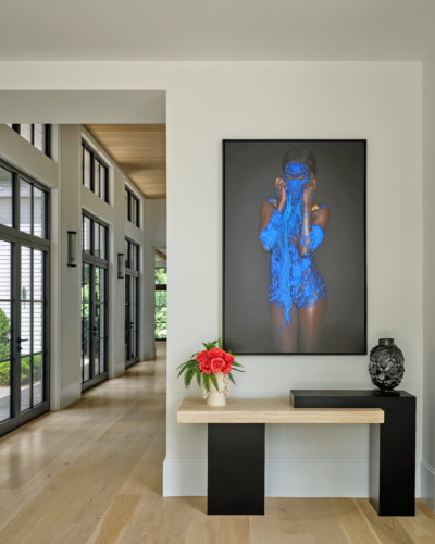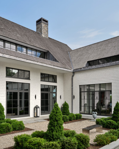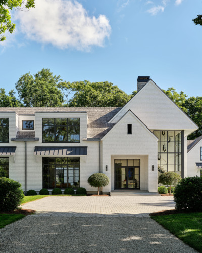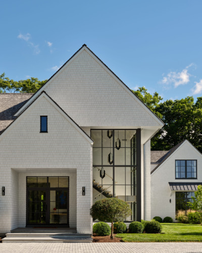 The house the couple chose was designed by Austin Patterson Disston Architecture & Design. Wrapped in creamy white shingles, with pitched roofs that alternate with expansive grids of glass, it is a sublime distillation of farmhouse and Bauhaus—at once both familiar and fresh. “Our firm calls it ‘modern agrarian,’ says architect Stuart Disston. “It’s a modern house, but it has traditional gables, so it fits in with the New England setting.”