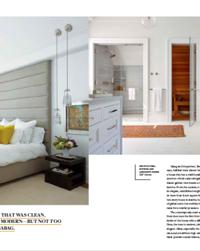 Sabag and his partner, Jim Hoffman, fulfilled their clients’ wishes with a house that has a traditionally inspired exterior—think cedar-shingle siding and classic gables—but boasts a modern interior. From the outside, it blends into its elegant, established neighborhood.