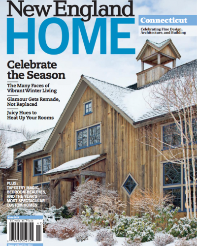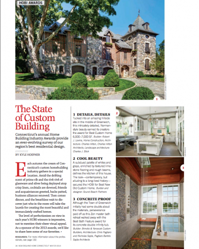 A subdued palette of whites and grays, enriched by textured limestone flooring and rough beams, defines the kitchen of this house. The look -contemporary but alluding to a long-lived history- secured the HOBl for Best New Old Custom Horne.